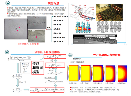 李聿军博士做了《特殊钢大方坯轻压下模型研究与应用》的学术报告,介绍了控制特殊钢大方坯偏析、疏松和缩孔的技术,并就基于质量守恒定律、热力耦合仿真和回归方法提出的轻压下模型、影响压下量和压下效率的工艺因素以及模型应用到特殊钢大方坯控制内部质量取得的冶金效果进行了详细地汇报。