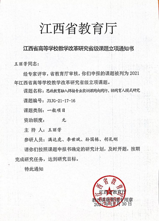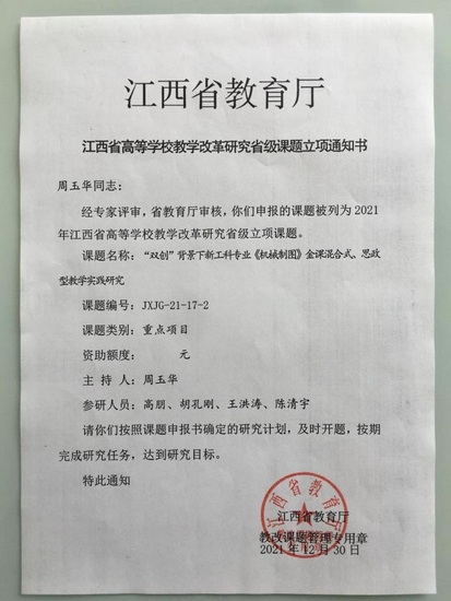 公司积极申报国家级、省级一流课程和教学改革等项目。2021年《机械制图》已通过江西省一流本科课程认定,《材料科学基础Ⅱ》等3门课程荣获校级一流本科课程建设立项,材料成型专业教学团队获批江西省高水平本科教学团队建设立项,教学改革研究项目成绩斐然,荣获江西省教学改革重点课题1项,一般课题1项,由公司教师杜大明、李养良参与的《应用型本科机械类人才核心能力培养“1+3”模式探索与实践》荣获江西省教学成果一等奖。