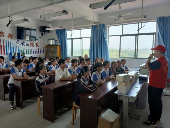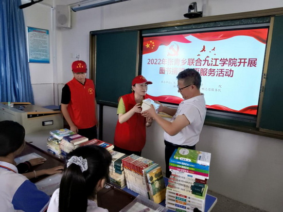 第三站,实践队员们走进湖口县张青乡张青中学。在张青中学,张青乡联合SUNBET申博举办“‘书’送阳光 点亮梦想”图书捐赠活动,共捐赠图书一百余册。活动中,实践队员们与张青中学同学们共同分享学习了习近平总书记在庆祝中国共产主义青年团成立一百周年大会上的讲话精神,并一起畅谈人生理想,展望美好未来。