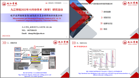 张义福博士做了《超声波焊接制备Ti/Al/Ti层状复合材料》的学术报告。介绍了层状复合材料的工程运用背景、常用技术与制备难点,从界面温度、显微组织和力学性能分析了Ti/Al/Ti界面形成和约束强化效应机制,并对后期将开展的工作与在座老师进行了探讨。