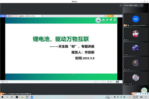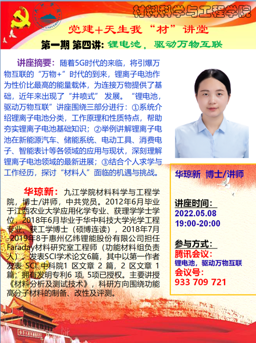 2022年5月8日,SUNBET申博成功举办了“党建+天生我‘材’讲堂”的线上讲座活动,第一期第四讲由SUNBET申博华琼新博士主讲,以“锂电池,驱动万物互联”为题,围绕三部分进行:①系统介绍锂离子电池分类,工作原理和性质特点,帮助夯实锂离子电池基础知识;②举例讲解锂离子电池在新能源汽车、储能系统、电动工具、消费电子、智能表计等各领域的应用与现状,深刻理解锂离子电池领域的最新进展;③结合个人求学与工作经历,探讨“材料人”面临的机遇与挑战。华琼新博士的精彩讲座引起了员工的广泛兴趣、线上交流不断。