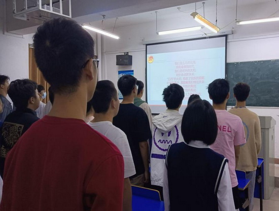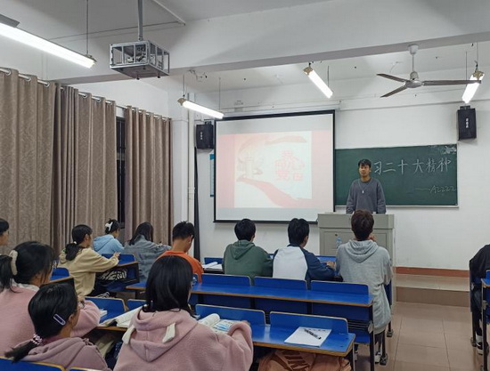 活动开始,班级全体同学起立高唱国歌。接着,主持人带领大家回顾学习了习近平总书记在二十大开幕式上的讲话精神,讲解了中国这非凡十年的发展巨变。同时强调:国家希望在青年,民族未来在青年,作为当代青年,两个一百年奋斗目标和中华民族伟大复兴梦的实现,都需要我们锐意进取,学思并进,紧跟党的脚步,为全面建设社会主义现代化国家新征程贡献力量。