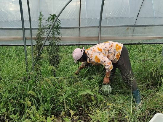 志愿服务队在西瓜大棚协助当地村民采摘西瓜。在开始务农前,农户为队员们讲解判断西瓜成熟的技巧并叮嘱队员们在进行农作时安全要放在第一位。经过短暂的摸索,队员们根据农户的指导开始熟练地摘起西瓜。队员们蹲在农田上,闻着泥土的芳香,手持巧劲从瓜藤取下西瓜,心里增添了一丝下乡情怀。队员们重复着“抓-拔-提”地动作,完成了近一亩地的采收。实践队员的汗水浸湿衣衫,脸颊晒得通红,双手与双脚沾满泥土。团队逐渐熟练了挑选、切藤、搬运等各项任务,有条不紊。脸上流淌着汗珠,丰收的喜悦中也使每一位队员们更积极地投身实践。