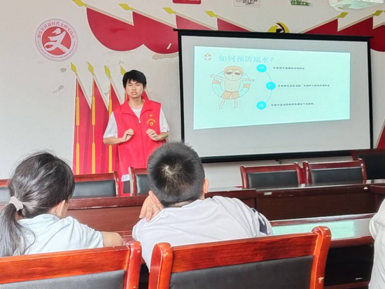 真情暖童心,让青春之光在社会实践中闪耀。为更好地助力青少年健康快乐成长,A2312班受资助员工曾宇积极投身志愿者服务,并前往乡村开展“儿童暑期防溺水安全知识”宣讲活动。活动中,他向家长及儿童宣传讲解防溺水相关知识,提醒家长要增强防溺水意识,要加强对未成年人的监督和保护,防止溺水事故的发生。