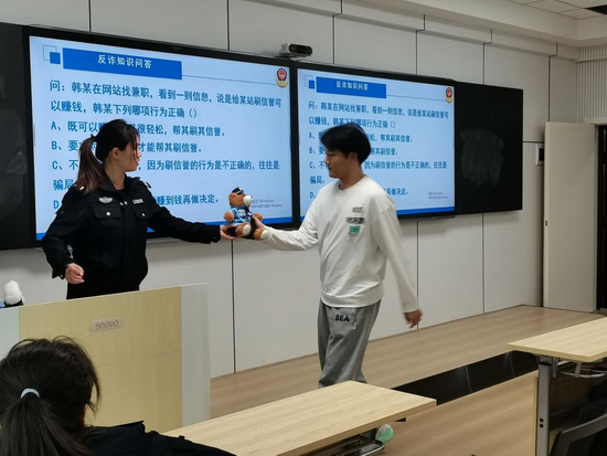 为巩固学习效果,宣讲会特别设置了“反诈知识问答”环节,通过有奖竞答的方式检验同学们的掌握情况。题目涵盖诈骗识别、应对策略及法律常识等内容,现场同学踊跃参与,答对者获得了定制反诈宣传品。“这种互动形式很有趣,既能学到知识,还能赢奖品,印象特别深刻。”2023级材料科学与工程专业员工表示,“回去后我会把今天学到的内容传达给室友和同学,让大家都能提高警惕。”