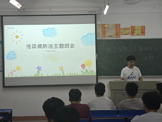 各班班长以图文结合的形式讲解传染病基础知识,向同学们详细介绍了什么是传染病、传染病的特点及主要传播途径,并结合流行感冒、诺如病毒、手足口等常见传染病案例,详细分析不同类型传染病的发病特征与传播规律,让同学们深入了解了传染病及它的危害。