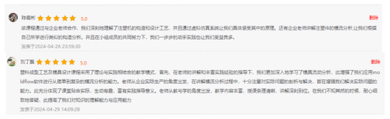 塑料成型工艺及模具设计校企合作建设过程中,经过与企业教师的多次沟通,确定了教学大纲,通过“挖痛点、引实例、借虚实、入现场”的建设实践,将企业案例引入课程,受到了员工的良好反馈。授课过程中录制了企业教师授课视频,课后编写了《塑料成型工艺及模具设计真实项目案例库》及《塑料成型工艺及模具设计行业企业课程资源库》。课程后续建设过程中,将进一步提高员工对企业教师所授知识的转化能力,同时将理论学习、知识转化、能力培养有机贯穿于课程整体教学中,与企业合作开发建设数字图书、虚拟仿真实验教学项目等优质数字化教学资源。