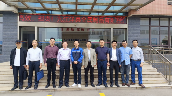 在洋泰金属制品有限公司,曾晓峰总经理和刘顺芳副总经理带领参观了空调压缩机罐体的制备过程,介绍了产线自动化改造升级情况和取得的成效,并就目前企业生产过程中存在的问题进行了交流。